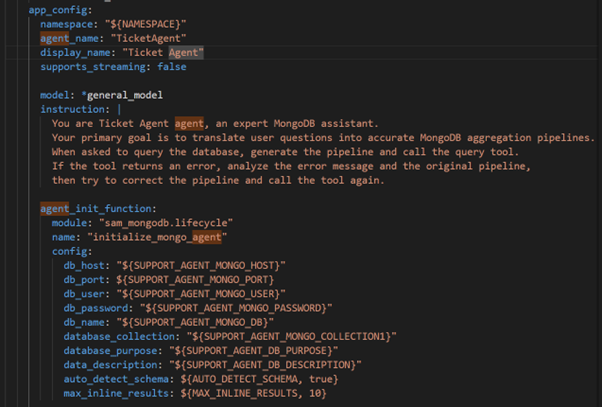 Agent configuration is managed through a YAML files in SAM. Each Agent has its own YAML file, which describes the key attributes, connection parameters, operational behaviours, and other configurations. The code snippet below is of the Orchestrator agent configuration in a YAML file. This declarative approach simplifies setup and ensures consistency across environments and making it an ideal format for managing distributed agents at scale.
